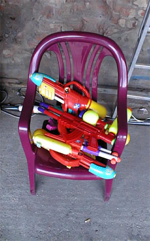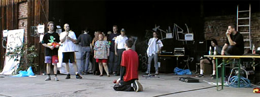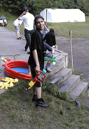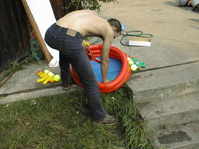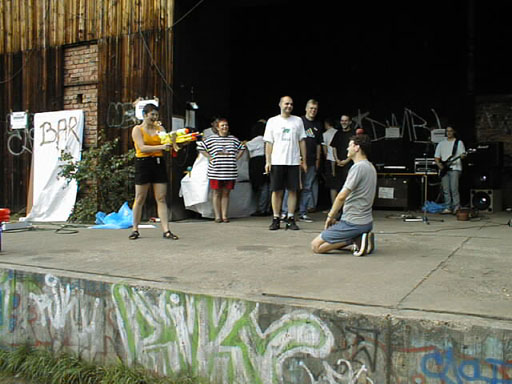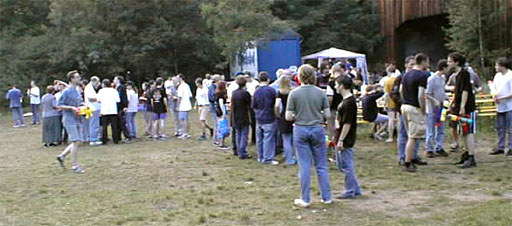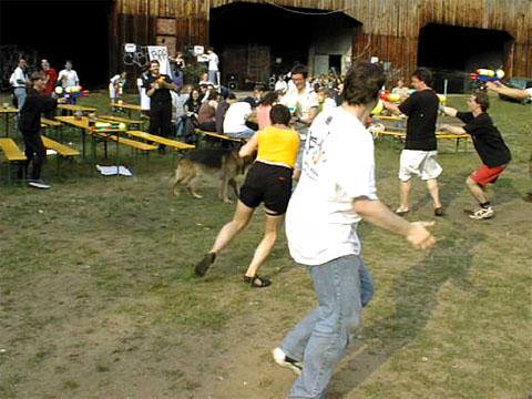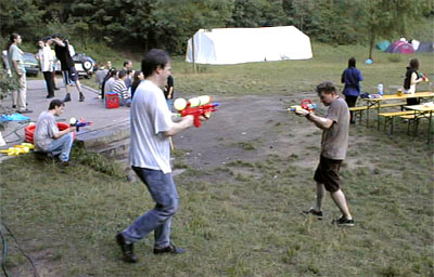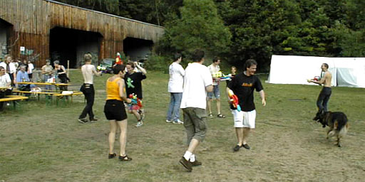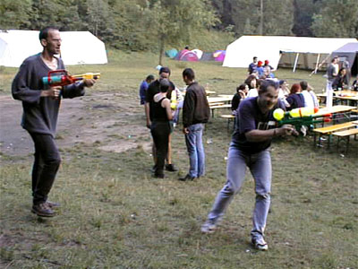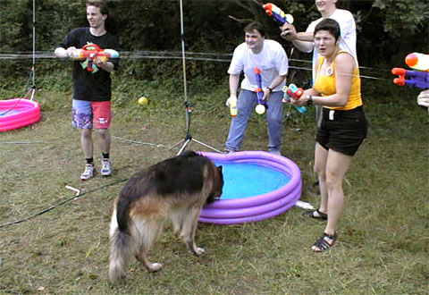 Als Überraschungsgeschenk wurden an die Party-Teilnehmer "Strahlenkanonen" ausgegeben, um nach dem gegenseitigen Eleminieren die leibliche Verköstigung der Übriggebliebenen in einfacher Weise sicherzustellen. Die wenigen, vorhandenen Wasserreservoire, die eigentlich für neutrales Territorium erklärt worden waren, waren dennoch von jederman (und -hund) hart umkämpft. |